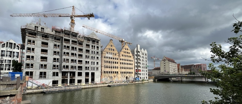 Vi kom fram till kanalen och gick över till andra sidan och tittade på några av alla nybyggen. De behöll skalen av ruinerna och byggde upp nya hus i samma stil. De två gula gavlarna på bilden var just, bara gavlar.