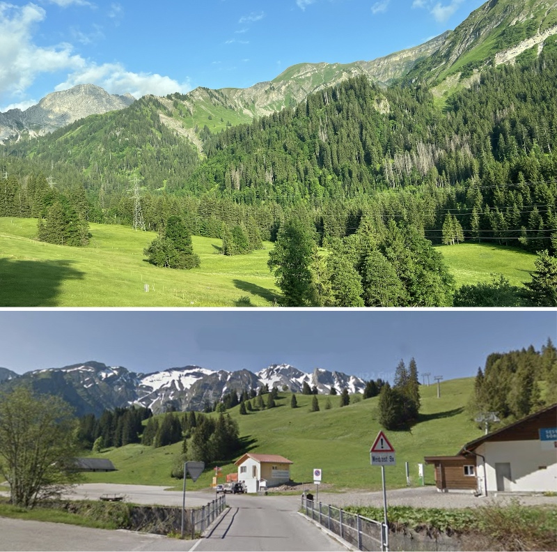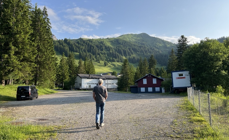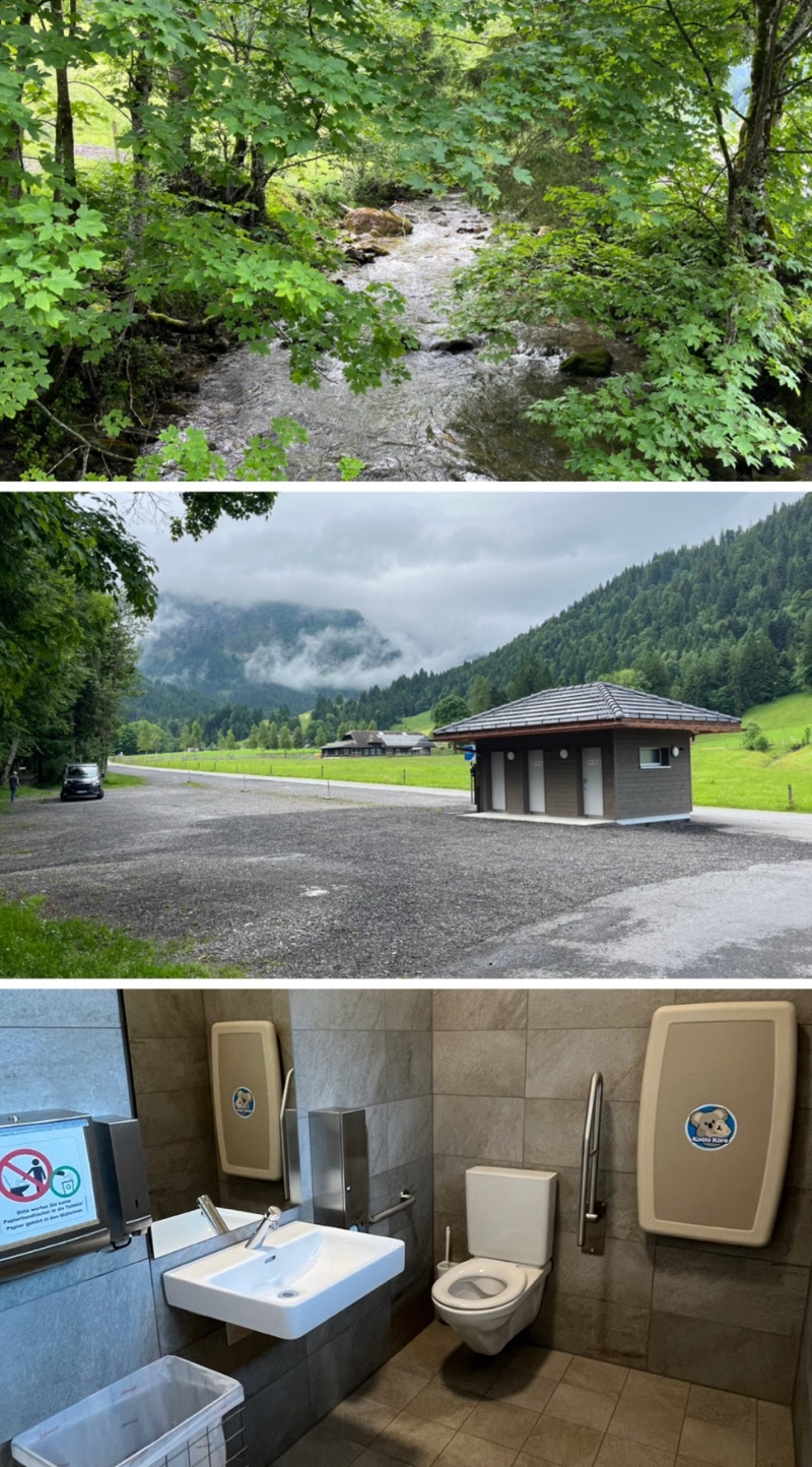 Väl framme visade det sig att ”park4night” återigen informerade helt fel. Ställplatsen med allt var en skidliftparkering utan det mesta. Men det fanns toaletter, ström med fel uttag och man fick betala 25 CHF.