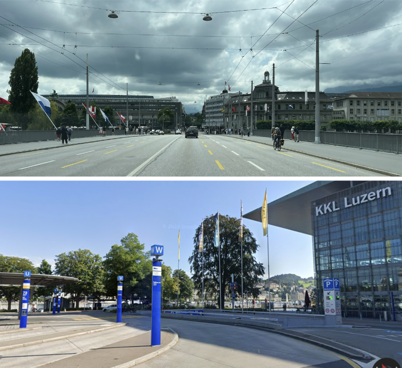 Till slut kom vi in i Luzern. Det fanns många parkeringar men de var svåra att hitta. Vi ville ju helst att det skulle var iallafall 2.15 högt. Men Bahnhof parkplaz var 2.25 och kostade bara 10 CFr (2,5h)