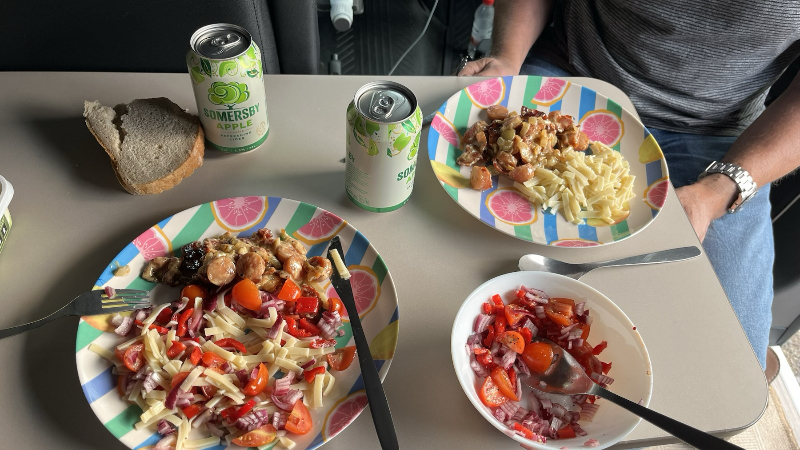 Hungriga magar mättades med det tredje paketet bacon, denna gången med korv och pastasallad till.