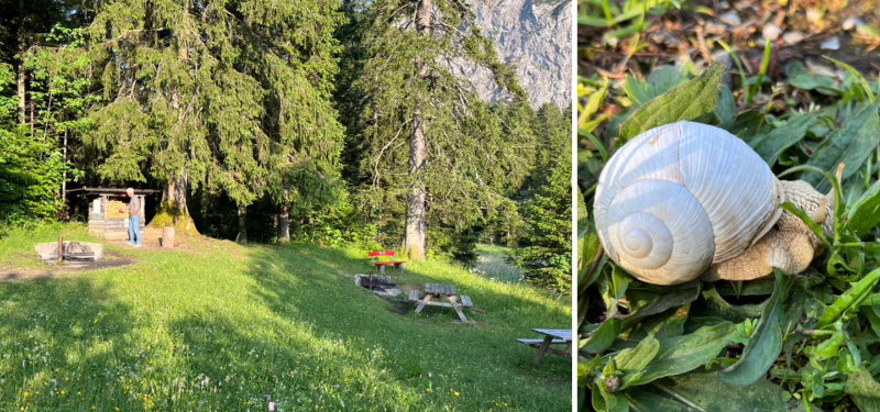 Grillplatser, välutrustade som i Arjeplog. Och en helvit snigel, ganska stor, skal som en golfboll
