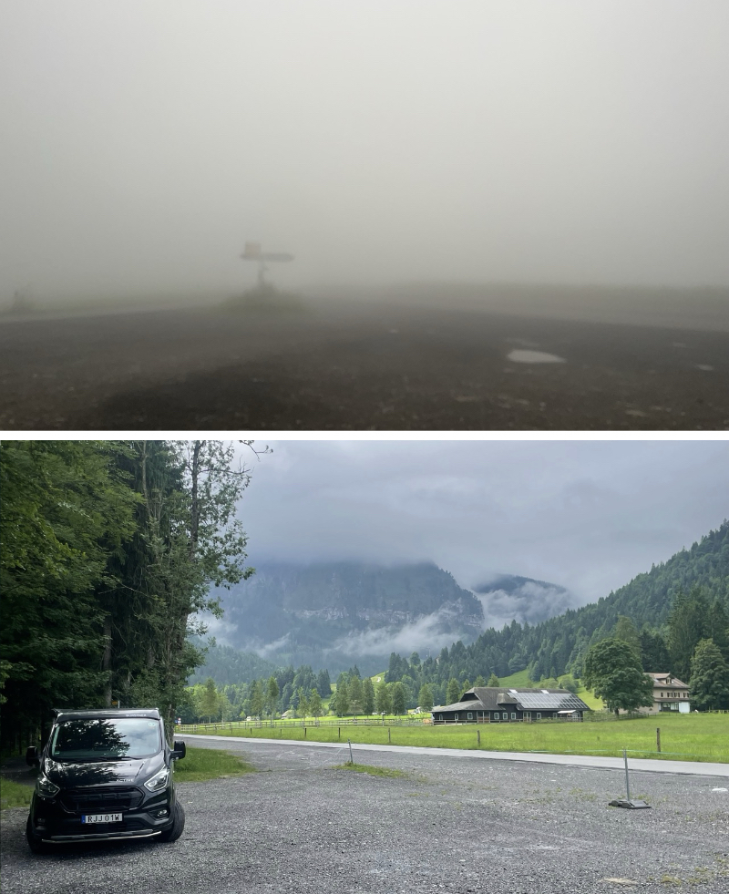 När vi vaknade vid 05, sen 07 upplevde vi det som vi ställt oss på busshållplatsen i centrum av en stad. Det var inte så men det var mer än en busslinje som stannade och många blev körda till bussen på morgonen. Och när vi kikade ut befann vi oss i ett moln.