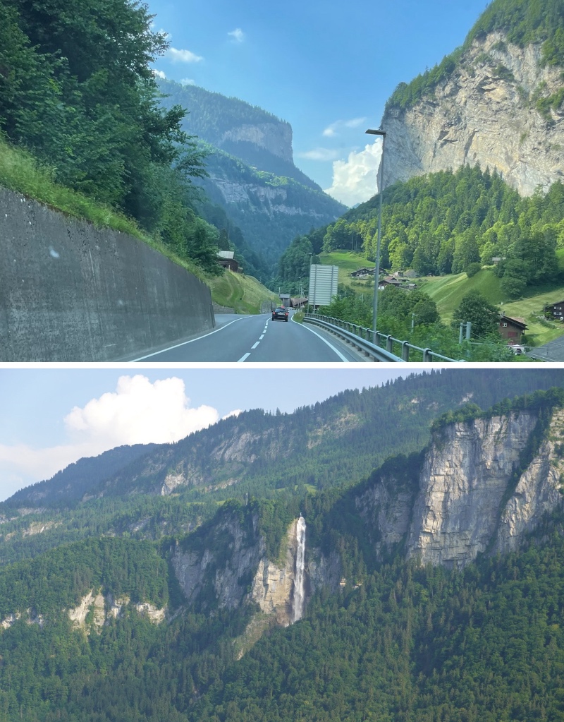 Därifrån gick ett tåg till Murren som är en liten by utan trafik typ 800 meter ovan dalen. Tåget gick ca 5 km från ändstation till ändstation och bilfritt? tja det var ganska många byggarbetarbilar som körde på gatan, och en del golfbilar på el