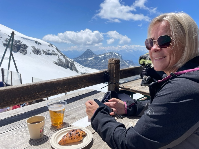 Ett par göteborgare kom och fick våra platser vid bordet medan vi flyttade till bänken med väggen som stöd. De hade testat skidåkningen och var på väg till Sardinien med bil. Vi satt nog där i solen i ett par timmar och pratade resor med dem innan vi åkte ner igen.