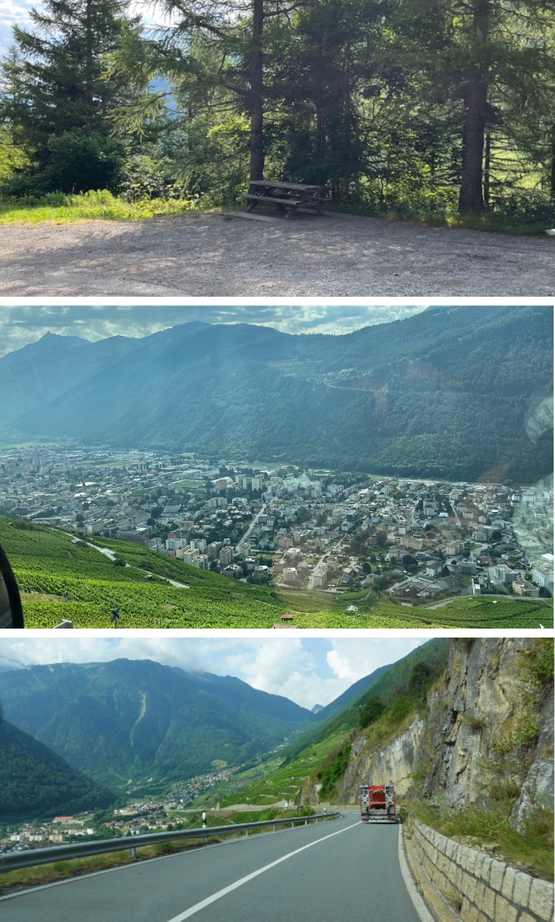 Vi vaknade efter en natt med rejält åskoväder i två omgångar. Eftersom solen inte kom åt i dalgången blev det kallt (20*) så vi åt snabbare frukost och kom iväg. Det är alltid roligt när man passerar ett ställe man har minne från sen tidigare resa. Denna gången var det bänken där vi fikade på vår väg till Chaumonix 2016. Vi lämnade höjderna och körde ner förbi Martigny.
