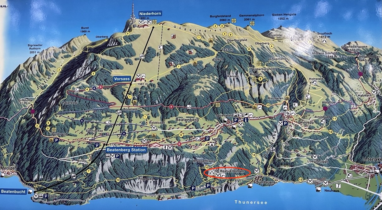 Det är alltid roligt med kartor. Denna visar sjön Thunersees nordkust. Här ligger också grottan St Beatus-Höhlen.