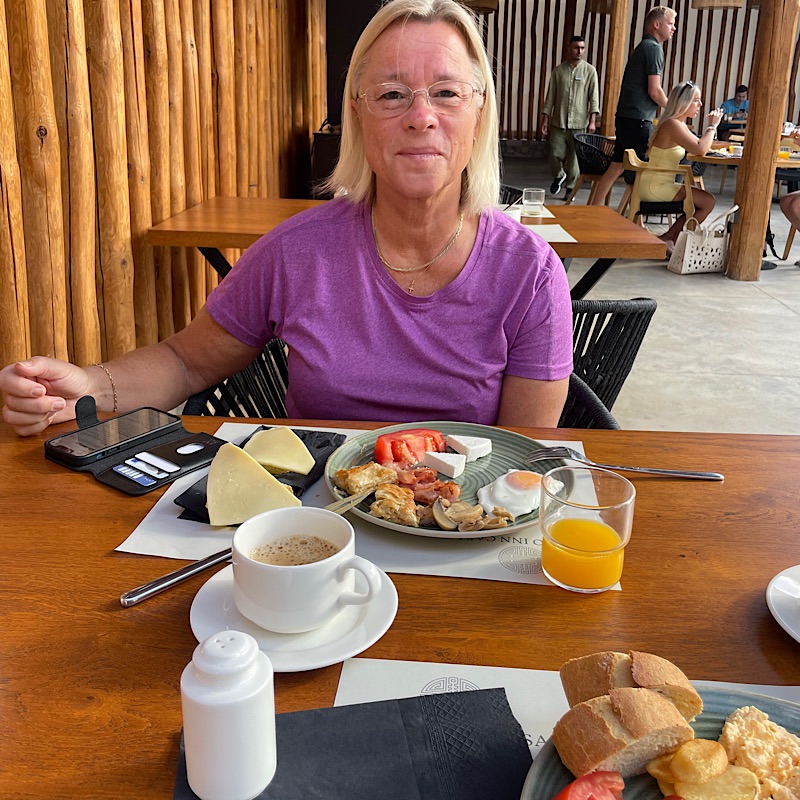 Vaknade 8.45! Trots den stenhårda sängen som skapade ont i kroppen. Frukosten på andra sidan gatan var helt okej, men var var plättarna?