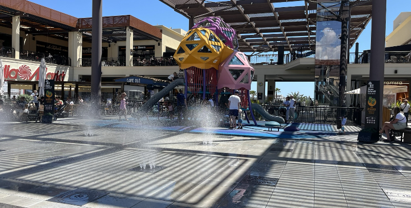 Det är ett stort köpcentra. Nu märktes det att det va sommar för nu var det vatten i alla fontäner. Denna jämte lekplatsen var ett roligt ställe för barnen.