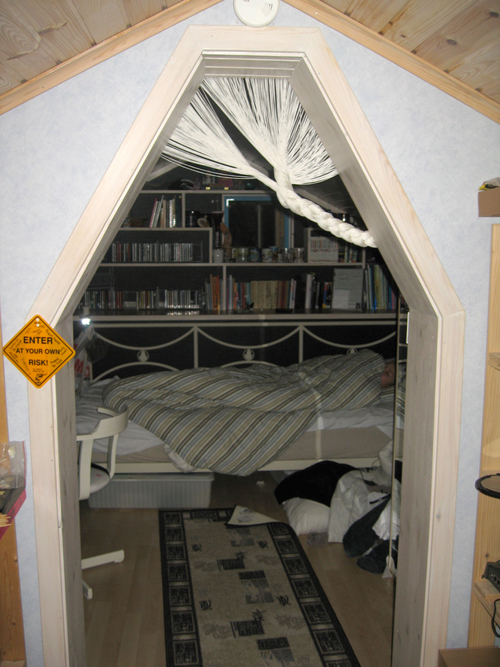 Nu är rummet inbott, hyllorna fyllda, bänken likaså och en garderob som fick sågas till för att få plats under snedtaket.